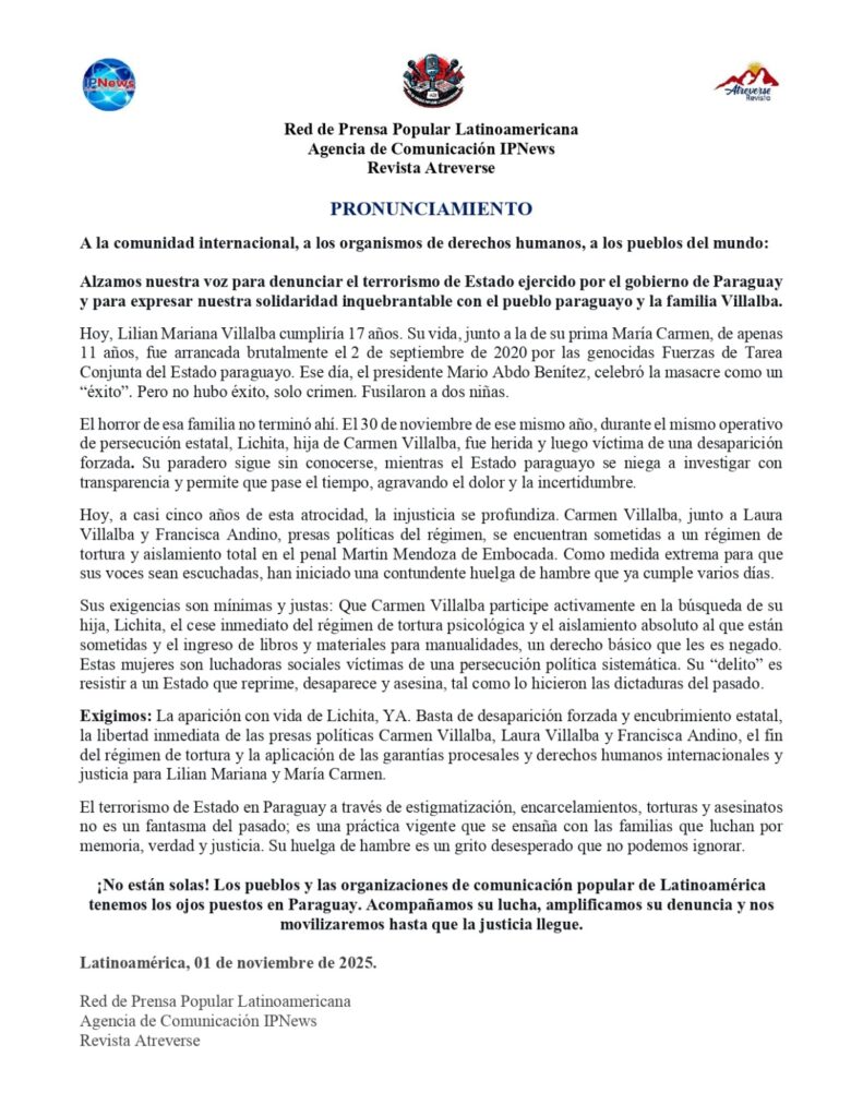 Alzamos nuestra voz para denunciar el terrorismo de Estado ejercido por el gobierno de Paraguay
