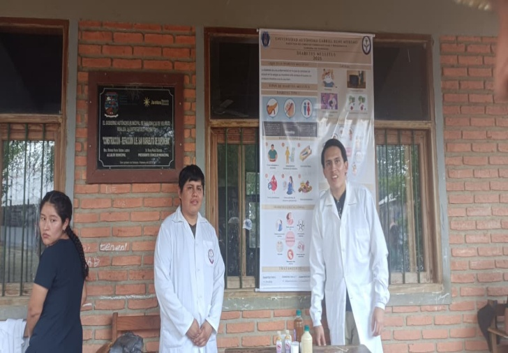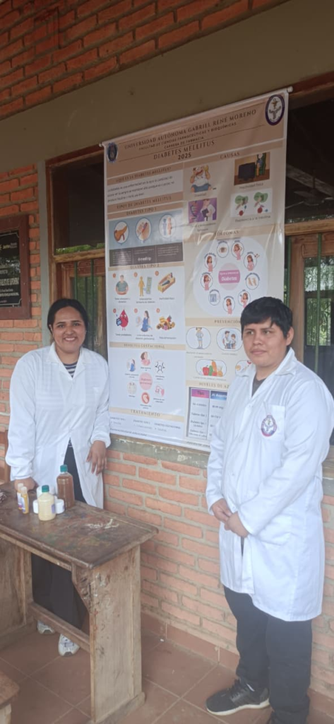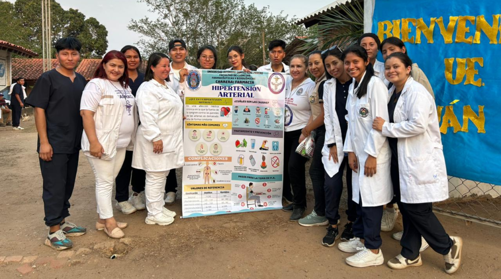 La actividad de extensión realizada en la comunidad de San Rafaelito de Suponema (pueblo Santa Ana, municipio de San Ignacio de Velasco) por la Carrera de Farmacia de la Universidad Autónoma Gabriel René Moreno se desarrolló del 10 al 12 de octubre de 2025 con el objetivo de fortalecer las competencias sociales y humanísticas de los estudiantes de 4.º año y contribuir a la Atención Primaria de Salud (APS) en una población de difícil acceso. Ante la limitada disponibilidad de agua, medicamentos y cuidados de rutina, el equipo interdisciplinario ofreció atención médica primaria in situ, toma de signos vitales, acciones de promoción y prevención dirigidas a hipertensión, diabetes, dengue, Chagas, tuberculosis, vacunación y técnicas de lavado de manos. Las actividades incluyeron charlas participativas en la unidad educativa, visitas domiciliarias, atención directa en el sitio y la entrega de materiales educativos permanentes (8 banners temáticos: tuberculosis; hipertensión; pirámide alimenticia; diabetes mellitus; dengue; vacunas; Chagas; lavado de manos), así como la entrega de kits de víveres y kits de medicamentos destinados a familias seleccionadas. Estas intervenciones se diseñaron para reducir barreras geográficas al acceso sanitario, facilitar la detección temprana de factores de riesgo y fortalecer la capacidad resolutiva de la red local de APS mediante la atención inmediata, la educación para la salud y la generación de vías de referencia para casos que requirieran continuidad asistencial.